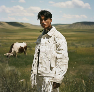 This Cyrus Dauphine collection "In a Few Miles We'll Be There Part 1" curated by Tyson Montgomery and the esteemed Cyrus Dauphine team is a masterful fusion of cultural heritage and contemporary style, captivating audiences with its meticulous craftsmanship and bold design choices. The collection opens with an arresting display of all-black ensembles, showcasing native beadwork hand-embroidered jackets, shirts, and trousers. Each piece exudes a sense of artisanal craftsmanship, with intricate beadwork forming geometric patterns and motifs that pay homage to indigenous cultures. The dark hue of the garments lends a sense of mystery and sophistication, setting the tone for the avant-garde elegance that permeates the collection. Transitioning seamlessly, the collection then introduces all-white suits adorned with the same exquisite native beadwork embroidery. The purity of the white fabric serves as a canvas for the intricate detailing, allowing the craftsmanship to take center stage. This juxtaposition of light and dark, purity and intricacy, creates a mesmerizing visual contrast that captivates the imagination. As the collection unfolds, it delves into a rich palette of chocolate, mahogany, and black suede jackets paired with beautifully tailored western trousers. These pieces exude a sense of rugged elegance, marrying luxurious suede with classic western-inspired silhouettes. The rich, earthy tones evoke a sense of warmth and sophistication, while the meticulous attention to detail ensures each garment is a testament to timeless craftsmanship. Finally, the collection reaches its crescendo with a statement piece: a brown leather oversized fight jacket paired with bold motif corduroy trousers. This ensemble epitomizes the spirit of rebellion and individuality, with its oversized silhouette and daring design elements. The juxtaposition of leather and corduroy, along with the bold motif detailing, creates a sense of visual intrigue and edgy sophistication. In summary, the Cyrus Dauphine collection curated by Tyson Montgomery and the Cyrus Dauphine team is a tour de force of sartorial innovation and cultural exploration. From the all-black native beadwork ensembles to the oversized leather fight jacket, each piece tells a story of craftsmanship, creativity, and the enduring power of fashion to inspire and enchant.